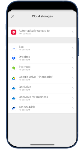 Exportieren Sie Ihre Dokumente in Ihren bevorzugten Cloud-Speicher, um weiter daran zu arbeiten, sie langfristig zu sichern oder zu teilen. Sie können zwischen automatischem Upload jedes Dokuments oder manuellem Hochladen ausgewählter Scans wählen. Wenn Sie Google Drive, OneDrive oder Dropbox verwenden, können Sie Ihre Scans in FineReader PDF for Windows weiter bearbeiten..