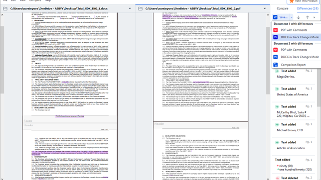 - Die erkannten Unterschiedewerden in den Dokumenten markiert und auf der rechten Seite zusammengefasst.