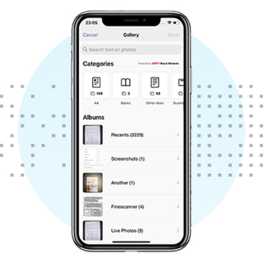 Neural network analyzes your gallery and automatically splits photos into seven categories: A4, books, business cards, handwritten, IDs, other docs, receipts. You can instantly search through the text on your photos. All images are securely processed offline on the device.